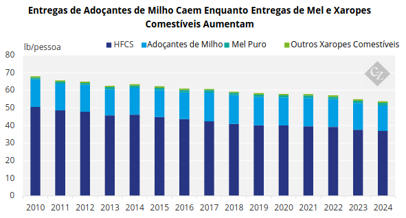 As entregas per capita de xarope de milho rico em frutose – HFCS (em inglês, High-Fructose Corn Syrup) foram de 36,9 libras, uma queda de 1,9% em relação a 2023. As entregas de HFCS atingiram o pico de 67,5 libras por pessoa em 1999 e caíram 41% desde 2003. As entregas totais per capita de adoçante de milho foram de 51,3 libras, uma queda de 1,5 libras, ou 2,8%, em relação a 2023. As entregas de mel e outros xaropes comestíveis foram de 2,4 libras por pessoa em 2024, um aumento de 14,3% em relação a 2023.