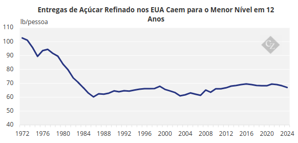 As entregas de açúcar avançaram em um ritmo melhor em comparação com os meses anteriores do ano, mas não foram tão fortes no acumulado do ano. De acordo com dados divulgados pelo Serviço de Pesquisa Econômica do USDA (antes da paralisação de 1º de outubro), as entregas de açúcar refinado para uso doméstico em alimentos e bebidas no ano civil de 2024 totalizaram 67 libras por pessoa, uma queda de 1,8% em relação a 2023 e a menor desde 66,7 libras por pessoa em 2012. O pico recente nas entregas per capita de açúcar refinado foi de 69,6 libras em 2016. O recorde histórico (em registros que datam de 1966) foi de 102,6 libras em 1972.