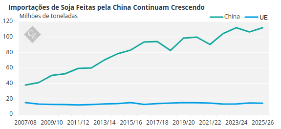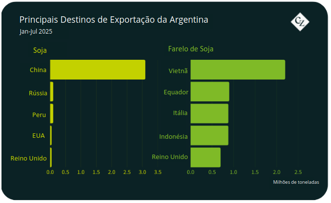 Isso ocorreu depois que o presidente argentino, Javier Milei, reduziu as taxas de exportação de alguns grãos. As taxas sobre o milho caíram de 12% para 9,5%, e sobre a soja e seus derivados, de 31% e 33%, para 24,5% e 26%, respectivamente. A China tem sido, de longe, o maior comprador de soja da Argentina em 2025 até o momento.