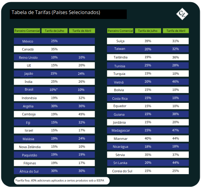 O prazo para o restante do mundo é 8 de agosto, quando os países sem acordo enfrentarão tarifas de até 50%.