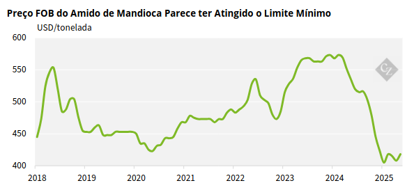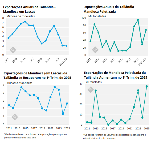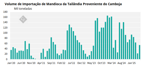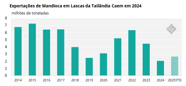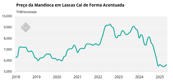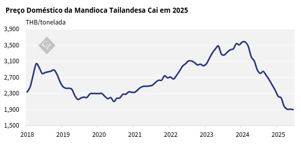 No início de 2024, época da colheita da mandioca, a Tailândia ainda importava grandes volumes de mandioca do Camboja, com os preços domésticos atingindo o maior nível em sete anos. Essa entrada significativa de mandioca importada pode ter contribuído para a forte queda nos preços observada em 2025.