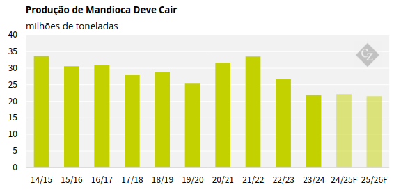 No entanto, as dificuldades de 2024 levaram muitos agricultores a reduzir suas áreas de plantio de mandioca. Como resultado, a produção total para as temporadas de 2025 e 2026 deverá cair para aproximadamente 21,5 milhões de toneladas, em comparação com os anos anteriores, quando a produção normalmente variava entre 26 e 28 milhões de toneladas.