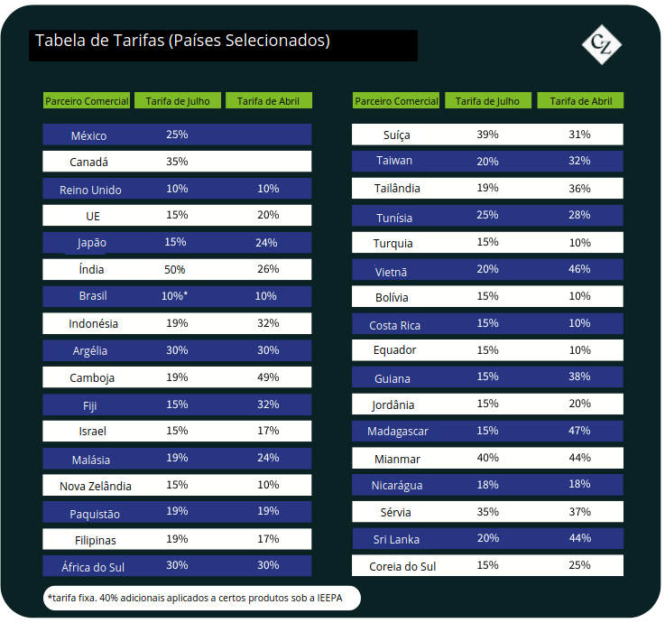 As relações comerciais entre os EUA e o Brasil estão igualmente tensas. Uma reunião em 13 de agosto entre o Ministro da Fazenda do Brasil, Fernando Haddad, e o Secretário do Tesouro dos EUA, Scott Bessent, destinada a abordar tarifas de 50% sobre as exportações brasileiras, foi abruptamente cancelada em meio a alegações de interferência política, embora os EUA não tenham confirmado essas alegações. As tarifas abrangem produtos como café, cacau e açúcar, mas excluem cerca de 45% das exportações brasileiras, incluindo petróleo bruto e fertilizantes.