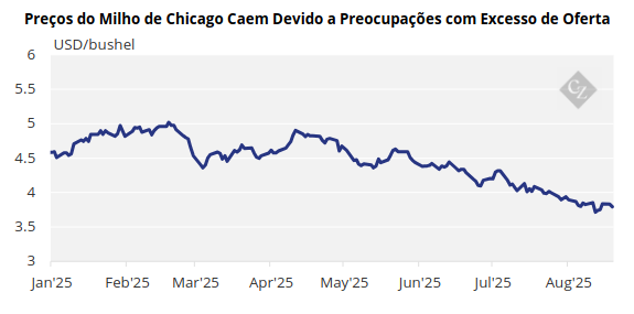 A grande safra empurrou o preço médio nacional do milho para USD 3,90/bushel – o menor desde 2019 – deixando muitos produtores abaixo do ponto de equilíbrio e aumentando a pressão no mercado.