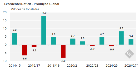 Nossas projeções mostram, então, um excedente menor de 3,4 milhões de toneladas para 2026/27.