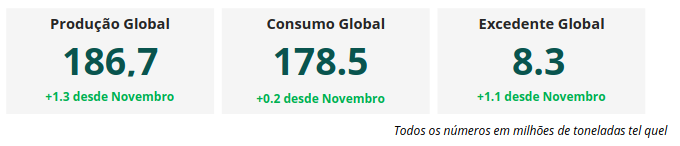 Nossa estimativa para o consumo global de açúcar aumentou minimamente em 0,2 milhões de toneladas, chegando agora a 178,5 milhões de toneladas.