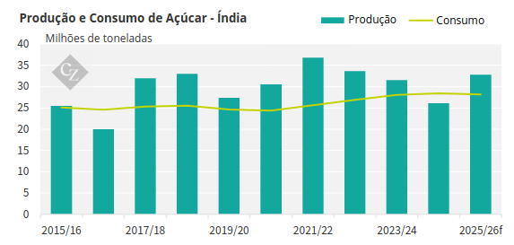 A produção de açúcar na Índia começou, e, até agora, tem sido expressiva. Atualmente, esperamos que o país produza 32,8 milhões de toneladas na safra de 2025/26.