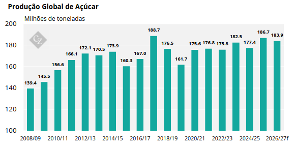 2025/26 poderá apresentar a segunda maior produção mundial de açúcar já registrada. Há indícios de que os principais países produtores de açúcar reduzirão a produção na próxima safra. O crescimento do consumo permanece fraco.