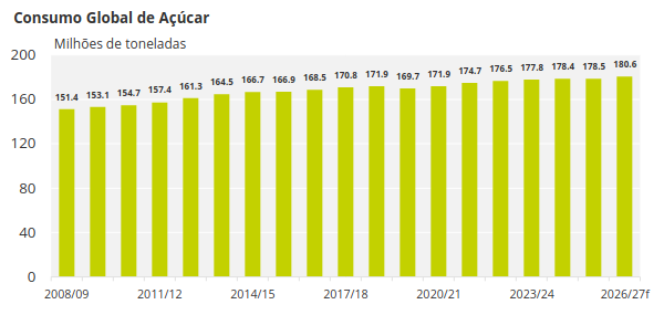 Nossas estimativas iniciais para o consumo em 2026/27 sugerem um crescimento de 2 milhões de toneladas em relação a 2025/26. Os preços do açúcar caíram pela metade desde o pico de 2023, e acreditamos que isso poderá sustentar um aumento no consumo à medida que os estoques globais se recompõem. Parte da recente fragilidade do crescimento em muitos países foi causada pela alta inflação dos preços dos alimentos, o que alterou o comportamento de compra. Esperamos que parte desse efeito diminua com a queda dos preços do açúcar e dos alimentos em geral.