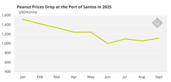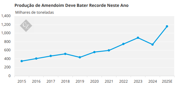 “A forte oferta tem impactado os preços de exportação do amendoim brasileiro, o que vem fazendo com que os produtores revejam parte de sua estratégia para o ciclo 2025/2026”, diz Wharlhey Nunes, analista da Consultoria Agro do Itaú BBA.