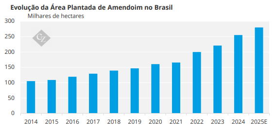 A cotação favorável da última temporada acabou motivando os produtores a ampliarem o cultivo. A área plantada de amendoim deu um salto, passando de 220,9 mil hectares em 2023 para 255,4 mil hectares em 2024 — na safra atual, o crescimento estimado é de cerca de 10%, segundo a Conab.