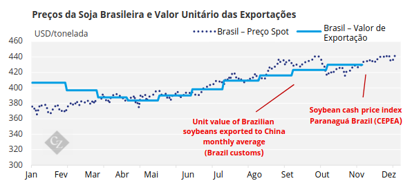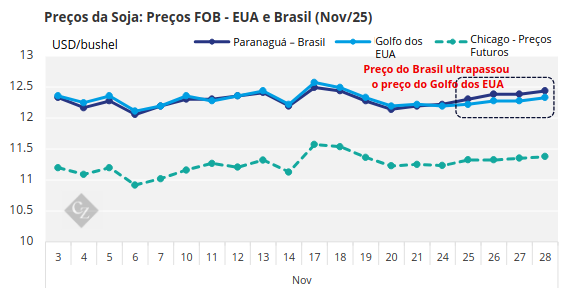 A recente movimentação dos preços brasileiros é a mais recente de uma tendência de alta desde a colheita da soja no Brasil, no início de 2025. O valor médio da soja exportada pelo Brasil, segundo dados alfandegários, subiu de cerca de USD 380/tonelada para USD 430/tonelada entre abril e outubro, um aumento acumulado de 13% em seis meses. A alta do preço FOB (porto de Paranaguá) acompanha o aumento do valor das exportações. Em novembro, os preços de Paranaguá ultrapassaram USD 440/tonelada pela primeira vez em 2025.