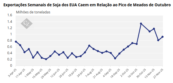 Segundo inspeções do USDA, as exportações semanais para o ano comercial de 2025/26 caíram para menos de 800.000 toneladas na semana encerrada em 20 de novembro, cerca de metade do pico de quase 1,6 milhão de toneladas registrado na semana encerrada em 16 de outubro, quando a soja dos EUA ainda estava com desconto em relação à soja do Brasil.