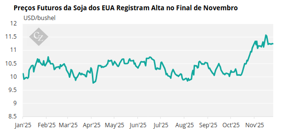 No final de novembro, a China retomou as compras de soja dos EUA pela primeira vez desde que os EUA e a China começaram a negociar tarifas seis meses antes. O USDA relatou seis grandes vendas para a China, totalizando mais de 1,9 milhão de toneladas entre 30 de outubro e 28 de novembro de 2025. Alguns participantes do mercado estimaram que as vendas para a China foram ainda maiores.