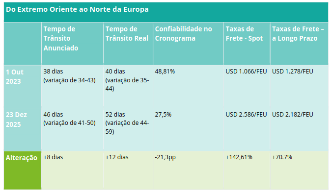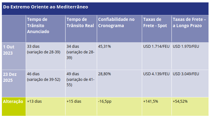 “Isso representaria uma reversão do congestionamento observado em 2024, quando os serviços foram ajustados para as rotas do Cabo da Boa Esperança imediatamente após a crise”, observou a Xeneta em seu relatório.