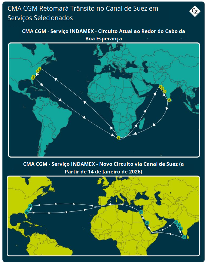 A CMA CGM, gigante francesa do transporte marítimo de contêineres, deu o primeiro passo no início de dezembro, ao anunciar que seu serviço INDAMEX transitaria pelo Canal de Suez tanto na ida quanto na volta, entre a Índia/Paquistão e a Costa Leste dos EUA. A CMA CGM já havia tentado anteriormente reintroduzir as áreas restritas em seus serviços, mas os acontecimentos da época impediram a continuidade dessas tentativas.