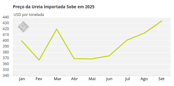 O preço da ureia, por exemplo — um dos principais componentes dos fertilizantes — subiu cerca de 23% desde 2024. Neste ano, o sinal de alerta começou a piscar em julho, quando os preços da ureia voltaram a subir.