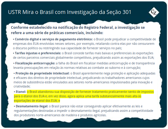- Até que a tarifa brasileira sobre o etanol dos EUA seja removida, aplicação integral da tarifa de 50% sobre as importações brasileiras recentemente promulgada pelo governo Trump.