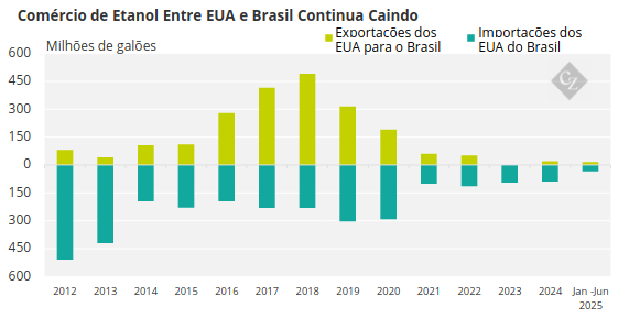 O Brasil exportou 313.341 metros cúbicos (313 milhões de litros) de etanol para os EUA em 2024, de acordo com dados aduaneiros do Brasil, com os compradores dos EUA favorecendo a menor intensidade de carbono no produto de cana-de-açúcar em comparação com o etanol de milho dos EUA em mercados-alvo de redução de gases de efeito estufa, como a Califórnia.