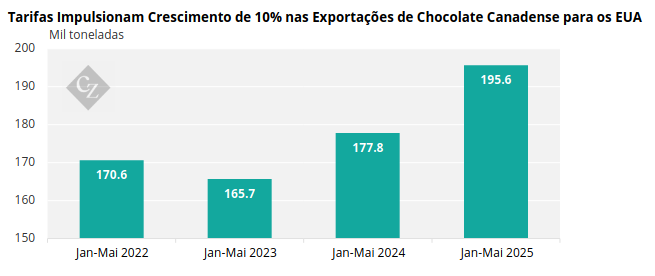 Isso já levou a um aumento de 10% nas exportações de chocolate canadense para os EUA, com gigantes como a Barry Callebaut alavancando sua presença de fabricação na América do Norte para lidar com o cenário tarifário.