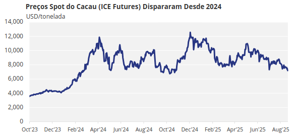Desde o início de 2024, o mercado do cacau tem sido abalado por aumentos de preços sem precedentes. Os contratos futuros dispararam de cerca de USD 3.500 para mais de USD 12.000/tonelada, impulsionados por interrupções no fornecimento na África Ocidental, causadas por safras ruins (devido ao clima), agravadas ainda mais por doenças, envelhecimento das árvores, mineração ilegal de ouro e preços historicamente baixos.
