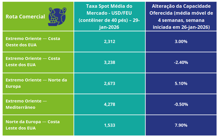 Abaixo, apresentamos alguns dados interessantes da Xeneta sobre as taxas spot diárias e as tendências de capacidade semanal nas principais rotas comerciais até o final de janeiro.