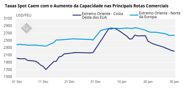 Peter Sand, analista-chefe da Xeneta, observa que as transportadoras de contêineres aumentaram a capacidade em janeiro para capitalizar a demanda tradicionalmente mais forte no início do ano nas principais rotas comerciais do Extremo Oriente. No entanto, o crescimento da capacidade superou a demanda, exercendo inevitavelmente pressão descendente sobre as taxas spot. Em 1º de janeiro, as taxas spot médias na rota Extremo Oriente–Costa Oeste dos EUA subiram 30%. Desde então, a capacidade ofertada aumentou 6%, enquanto as taxas spot caíram 18%.