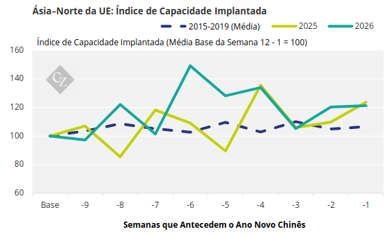 O gráfico destaca a magnitude dessa mudança. De 2015 a 2019, o aumento da capacidade pré-Ano Novo Chinês na rota Ásia–Norte da Europa foi relativamente moderado (aumento de aproximadamente 10%, da base de referência ao pico).