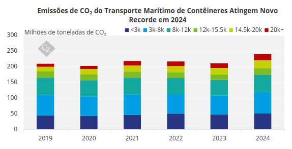 As emissões globais do transporte marítimo de contêineres aumentaram 14% em 2024, atingindo 240,6 milhões de toneladas de CO₂ e superando o recorde anterior de 218,5 milhões de toneladas em 2021.