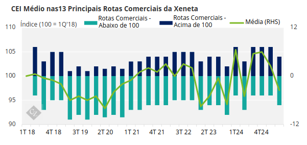 Apesar da crise em andamento, dados recentes da Xeneta e da Marine Benchmark sugerem que o desempenho em termos de carbono do transporte marítimo de contêineres está começando a melhorar. O Índice de Emissões de Carbono – CEI (em inglês, Carbon Emissions Index), que monitora as emissões nas 13 principais rotas comerciais globais da Xeneta, caiu abaixo de 100 pontos pela primeira vez em 12 meses, registrando 97,4 no segundo trimestre de 2025.