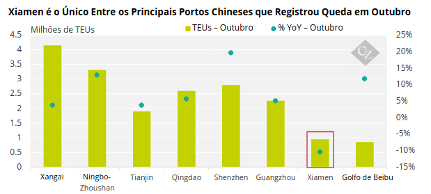 Entre os oito principais portos mencionados na tabela, Xiamen foi o único que registrou queda no volume de contêineres em relação ao ano anterior. Foram movimentados 7,42 milhões de TEUs, representando uma queda de 4% em relação ao ano anterior. Especificamente em outubro, Xiamen sofreu uma queda de dois dígitos, de 10,4%, movimentando 950.000 TEUs.
