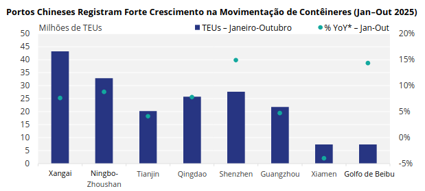 Xangai permanece na liderança, processando mais de 43 milhões de TEUs de janeiro a outubro de 2025, um aumento de 7,6% em relação ao ano anterior. O complexo portuário de Ningbo-Zhoushan veio logo em seguida, movimentando quase 33 milhões de TEUs, com um aumento de 8,8%.