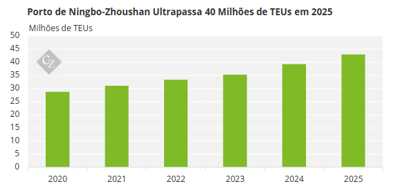 O segundo maior complexo portuário da China também alcançou um ano recorde, ultrapassando a marca de 40 milhões de TEUs pela primeira vez em sua história.