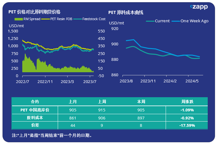 - 上周早些时候,中国PET树脂出口价格下滑,至周五平均905美元/吨,下跌20美元。